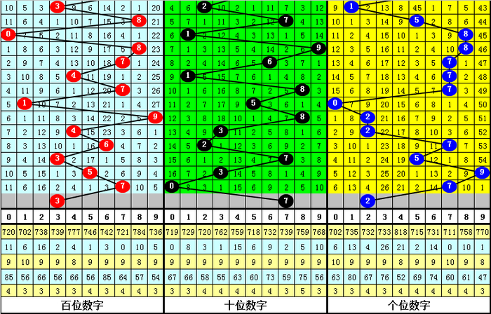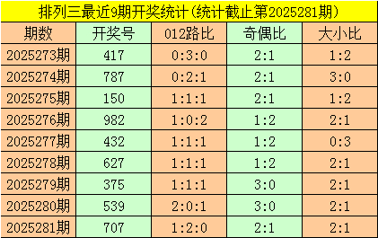 二、体彩陈列三前9期奖号开出:417-787-150-982-432-627-375-539-707,其中奖号大小比为15:12,012路比为8:11:8,奇偶比为17:10;