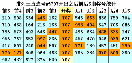 四、陈列三直选号码707历史上开出7次,其前后五期奖号离别为: